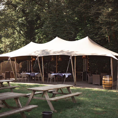 Er kunnen zijwanden geplaatst worden zodat je de tent een gedeelte of in het geheel kan sluiten.